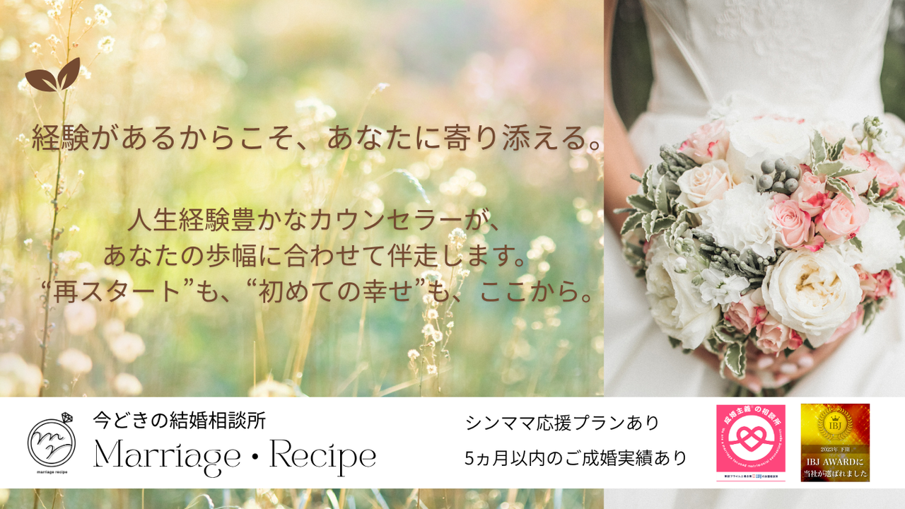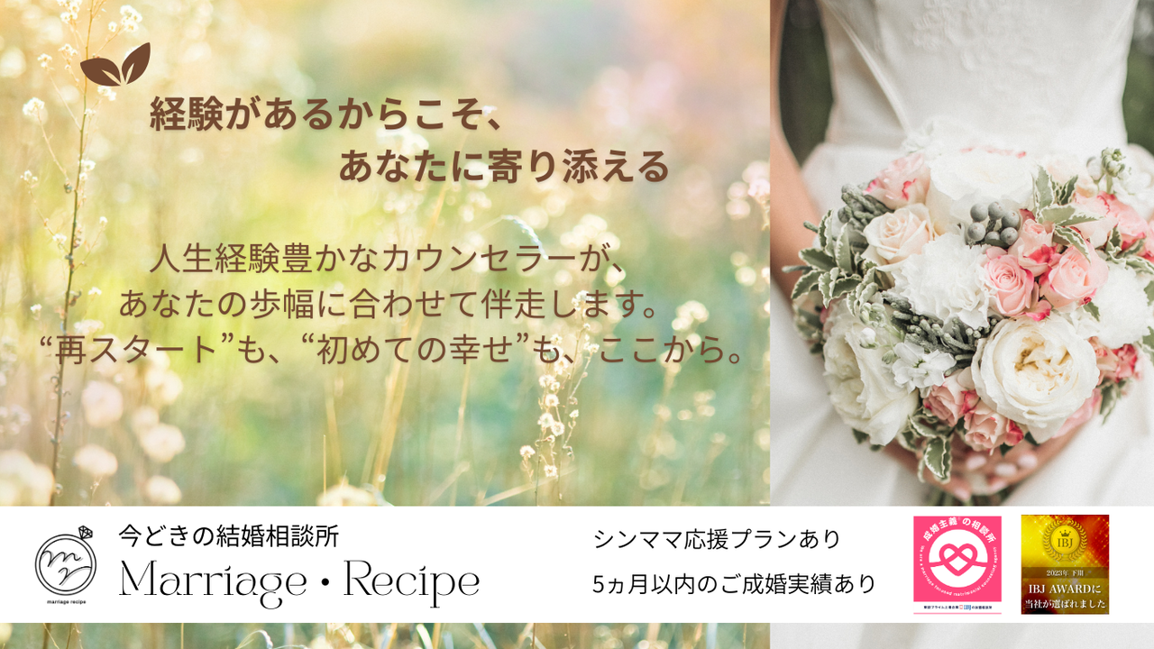 一人で頑張る婚活から伴走者がいる婚活へシフトチェンジしましょう!Marriage・Recipeには、シングルマザー経験から再婚したなど経験豊富なカウンセラーが在籍しております。また、大手相談所でのカウンセラー経験を活かし寄り添ったサポートを心がけて応援させていただきます。